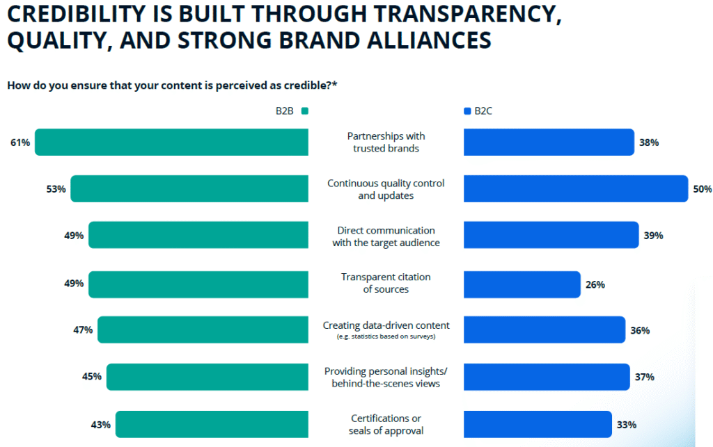 Troisièmement, une communication directe et transparente avec l’audience, citée par 49% des marketeurs, aide à construire l’authenticité et à encourager des relations basées sur la confiance. Parallèlement, la citation transparente des sources d’information, également à 49%, améliore la traçabilité et renforce l’intégrité perçue du contenu.