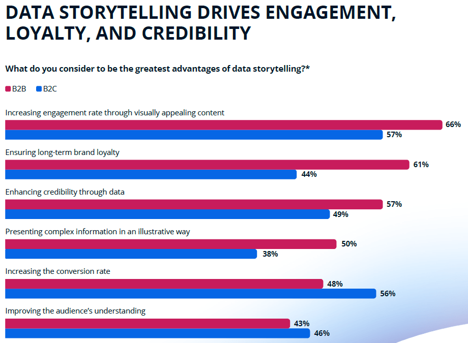 Les entreprises qui l’utilisent déjà en perçoivent des avantages stratégiques clairs. Les plus cités sont l’augmentation de l’engagement grâce à des contenus visuellement attrayants (66%), le renforcement de la fidélité à la marque à long terme (61%), et l’amélioration de la crédibilité grâce aux données (57%). Le data storytelling est donc un levier puissant pour asseoir la confiance de l’audience.
