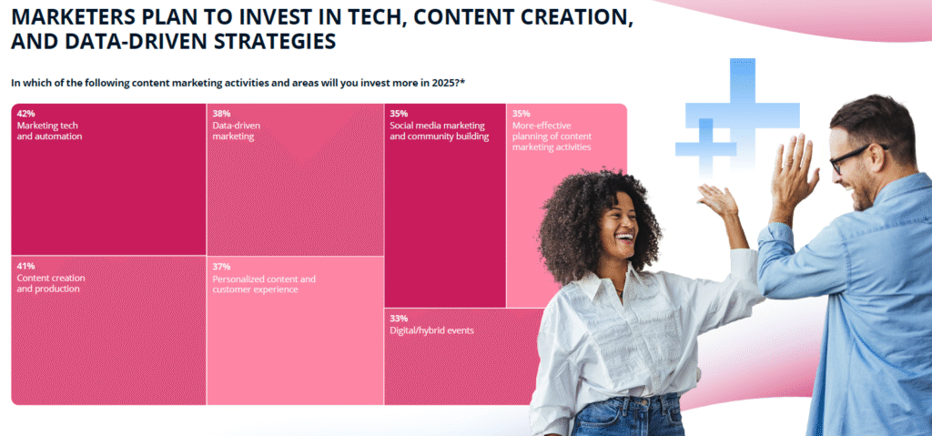Les intentions stratégiques se traduisent dans les budgets. En 2025, les entreprises prévoient d’investir principalement dans quatre domaines. La technologie marketing et l’automatisation arrivent en tête (42%) pour améliorer l’exécution et la scalabilité. Juste derrière, la création et la production de contenu (41%) restent une priorité pour garantir la qualité et la flexibilité. Le marketing basé sur les données (38%) et le contenu personnalisé (37%) complètent ce tableau, soulignant une volonté d’ancrer les stratégies dans les besoins réels des audiences.